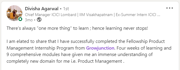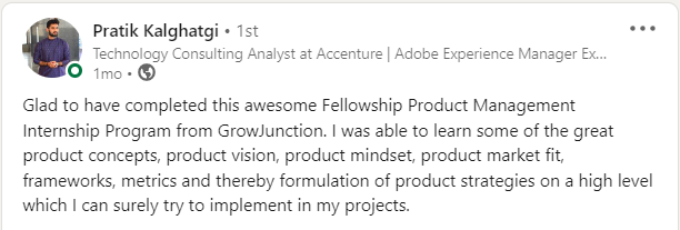 After completion of Program, you can put on your CV and LinkedIn as Fellow Product Management at Grow Junction (Our program is equivalent to experience and which is more valuable in the eyes of recruiters)